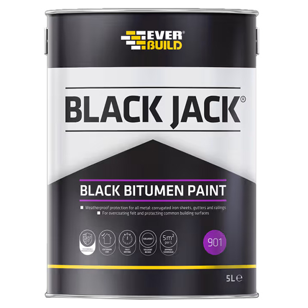Solvent based, full bodied black bitumen paint, When dry, the product forms an odourless and taint free bitumen film suitable for the protection of metals, concrete roofing, felt, fibre cement, corrugated iron, asphalt and wood against water attack. It is fast drying and is ideal for use on most common building surfaces.
