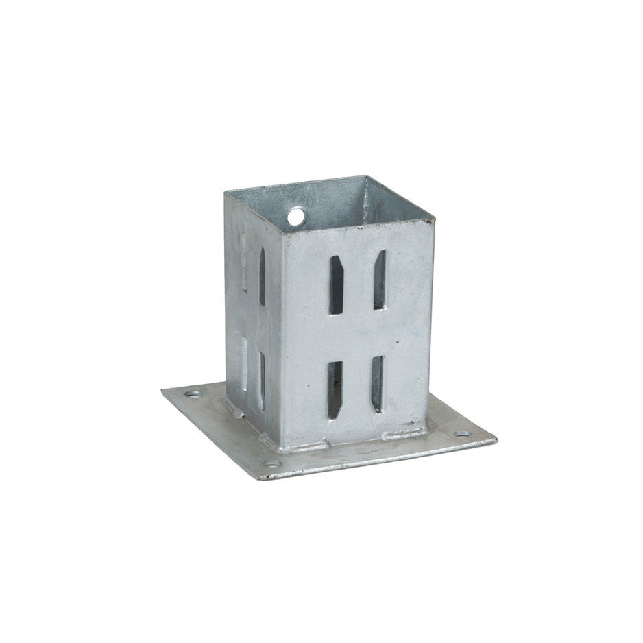 This post support is designed to hold a 75 x 75mm square wooden post in position when it’s not possible to concrete a post into the ground. The metal fins inside of the post support wedge into the timber ensuring a quick and secure fit. - Designed to fit 75 x 75mm square wooden posts - Fin-Grip post support system - Bolt down plate: 150mm x 150mm - Bolt holes: 4 x 12mm Ø holes for bolting down the base (approx. 115mm hole centres) - Manufactured from 2mm thick steel - Welded construction - Galvanised finish for durability outdoors