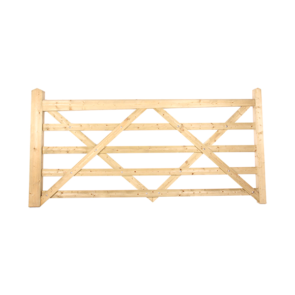 The 2438mm (8') Somerfield gate is a great value, traditional style of 5 bar wooden gate. It has a strong morticed and tenoned construction, a tapered top rail which is stronger and heavier at the hanging end, tapering down to a lighter swinging end. It is made with joinery grade treated softwood and has a planed finish. The Somerfield gate is equally at home in a field, a garden, or at the end of a driveway as a single gate or as part of a pair.