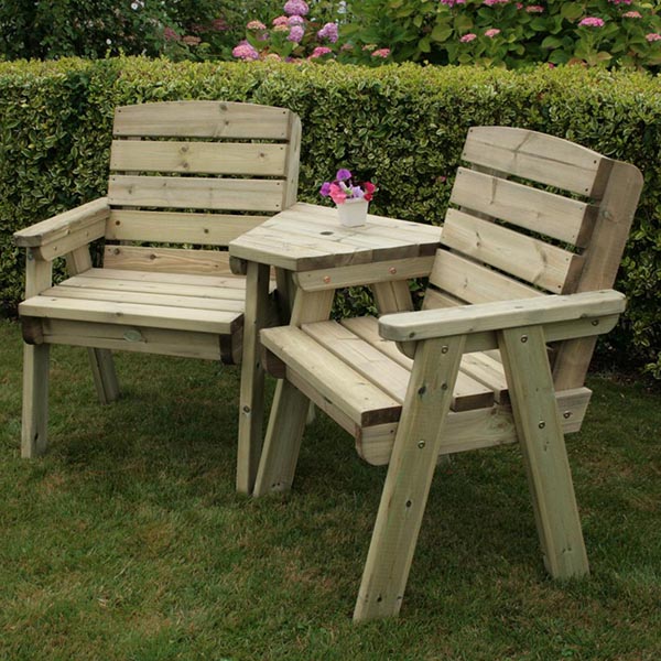This charming set includes two seats and a central table, perfect for relaxing with a friend or family member. Made from high-quality timber, it offers durability and a classic aesthetic that suits any outdoor space.