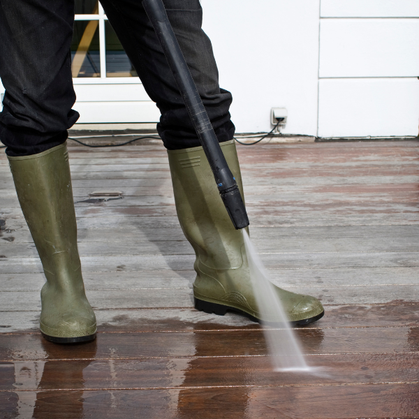 Step 2: Use a garden hose to spray down and clean composite decking.