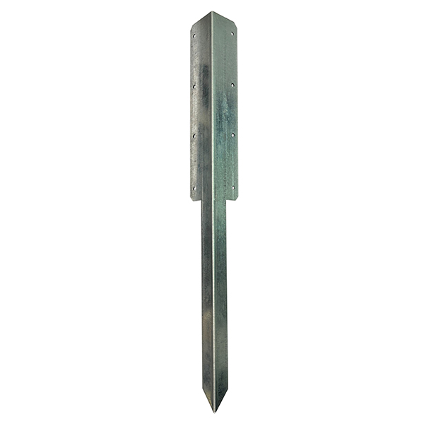 A metal stake (pin) designed for installation of timber sleepers, use them to build raised beds and timber garden edging. The sturdy but slim profile of the pin is easy to drive into hard ground. - Total Length: 440mm - Stake Profile: 35mm x 35mm x 2.0mm - Fixing plate: 75mm x 117mm (overall) - Fixing Holes: 4 x 8mm diameter - Galvanised finish