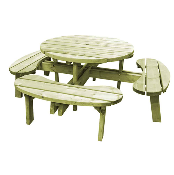 Manufactured using pressure treated softwood. This round picnic table is supplied as a flat-packed kit; in pre-assembled sections that bolt together. All fixings and instructions are included.