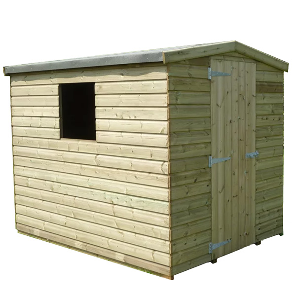 High quality, fully pressure treated garden shed. Constructed using ex. 25mm x 125mm (20mm finished thickness) tongue and groove for the floor and roof sections, and ex 19mm x 125mm (15mm finished thickness) shiplap for the walls. This shed has ample headroom; 1.8m at the eaves & 2.0m at the ridge.